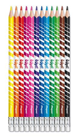 innovatív, újrahasznosított alapanyag 100% famentes, háromszög alakú ceruzatest 2,9 mm-es, vastag, puha és ellenálló hegy élénk színek könnyen hegyezhető radír vég